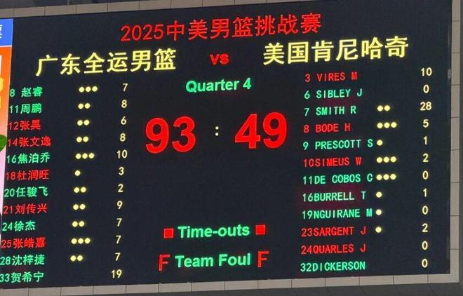 广东队93-49大胜美国球队,单节31-7半场47-17,杜锋对张皓嘉不满
