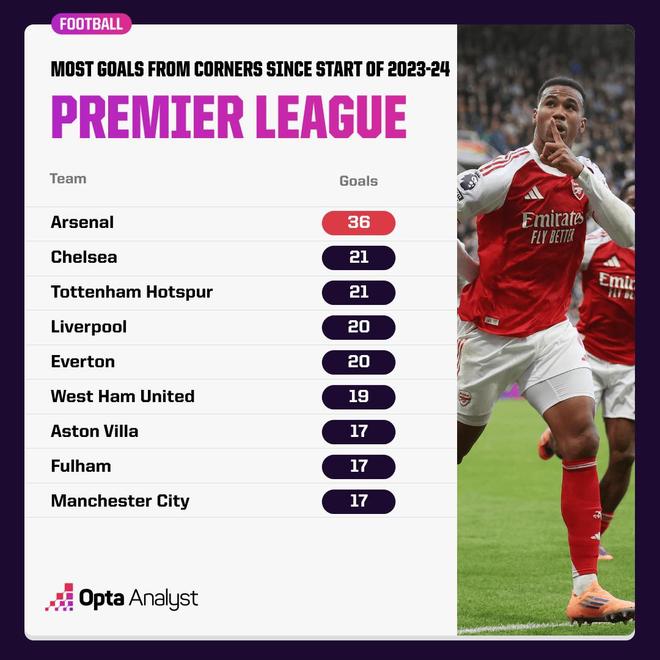 自2023-24赛季开始,阿森纳已经在英超通过角球打进36球,比任何其他球队都至少多15球。除了切尔西(21)、热刺(21)、利物浦(20)和埃弗顿(20),没有其他球队能突破20球。实际上,只有这四队加上西汉姆联(19)能够达到阿森纳的一半角球进球数。
